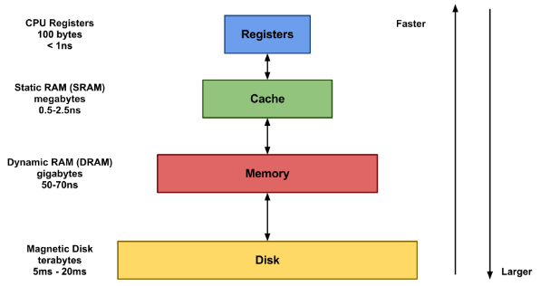 컴퓨터 메모리 계층 구조를 살펴보면 위로 갈수록 빠르지만 용량은 적고 , 아래로 갈 수록 느리지만 데이터를 저장할 수 있는 용량은 커짐을 볼 수 있습니다