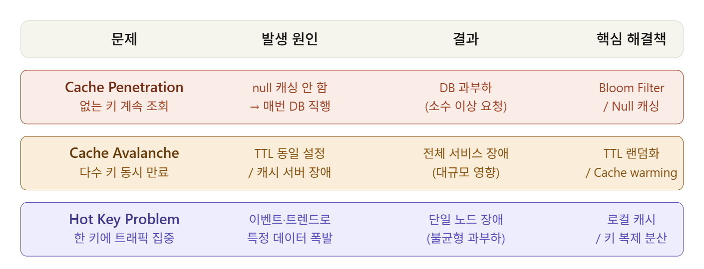 실무에서는 이 세 가지가 겹쳐서 발생하기도 하니, 시스템 설계 단계부터 TTL 전략, Bloom Filter 적용 여부, 로컬 캐시 레이어 구성을 함께 고려하는 게 중요합니다.
