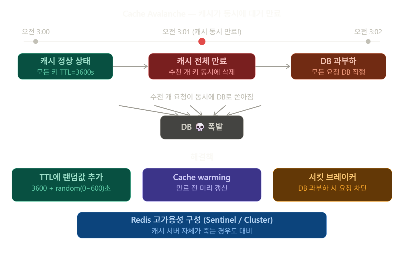 이렇게 되면 정확히 1시간 뒤에 수천 개의 캐시 키가 동시에 만료됩니다. 이 순간 사용자 요청은 그대로 들어오는데, 캐시에는 아무것도 없으니 전부 DB로 향합니다. DB는 갑자기 수천 배의 쿼리를 받고 터져버리고, 사이트 전체가 다운됩니다.